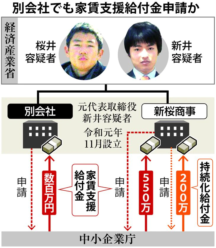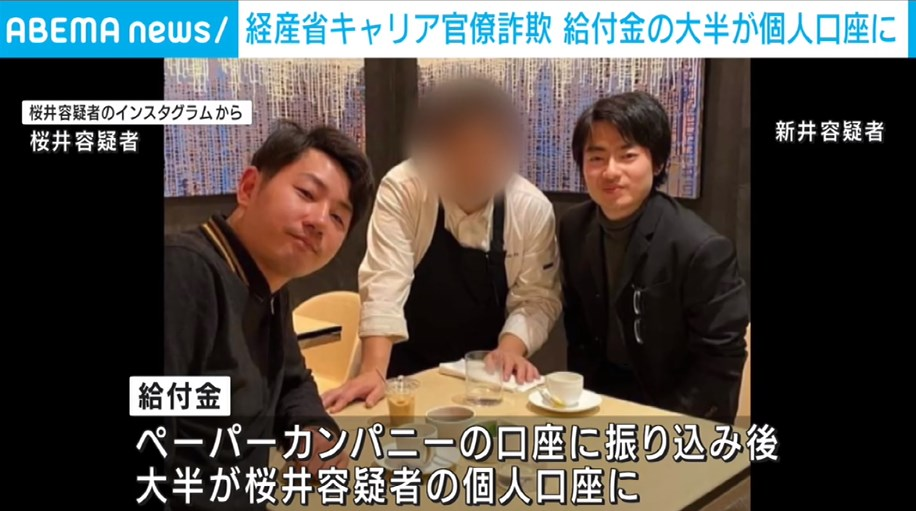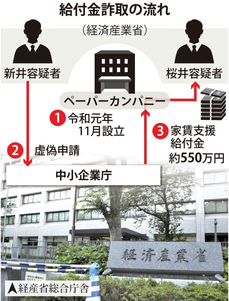 二人は、昨年12月、互いの苗字を冠し、投資目的で設立した『新桜商事』というペーパーカンパニーの口座に家賃6ヵ月分に当たる給付金約550万を振り込ませた疑いで逮捕され、二人とも経産省キャリアなので給付金の制度は熟知してことも関係しています。