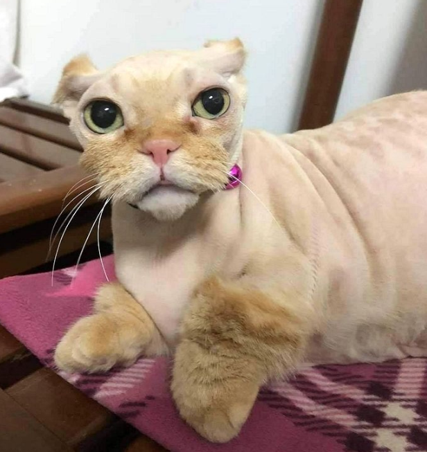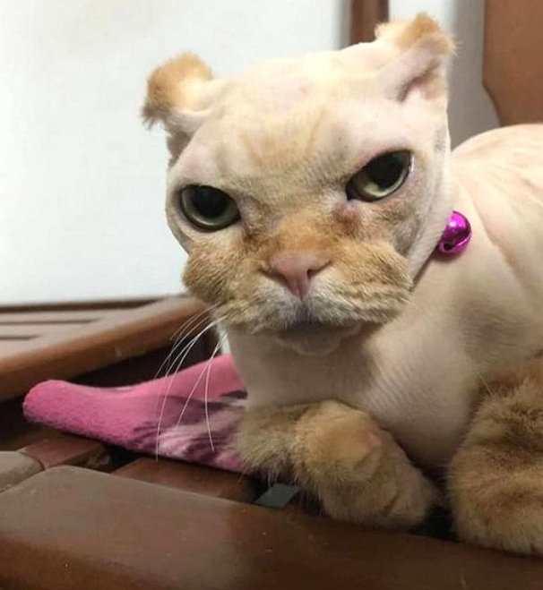 だが悲劇はその後起こったのでした。胴体に続き、顔まで美容を始めた飼い主は、たちまちスコティッシュフォールドを毛のないスフィンクス猫のようにしてしまったのでした。それも耳と鼻の周り、前足の部分は毛を少し残してあるのでまるで’円形脱毛’を連想させます。ただならぬ気がしたのだろうか、おとなしい表情をしていた猫は、しだいに荒れ狂い始めたのでした。後には「飼い主よ、俺を見ろ」と言わんばかりに顔をしかめ、笑いを誘ったのでした。