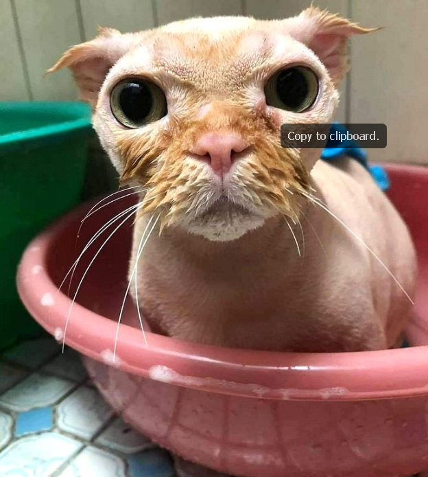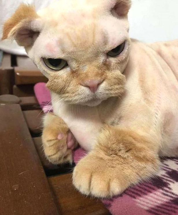 「これはにゃんだ!にゃんだ!」 「俺の毛を返せ!」という熱い目で飼い主を睨む猫。 スフィンクス猫のようだが、金色の毛が所々見えるのは何かおかしく見えます。後で分かったことだが、猫は毛深いスコティッシュ·フォールドで、飼い主に毛を刈られ「デモ」をしているところだったのでした。恨み交じりの猫の目つきは、ネットユーザーらを笑わせました。