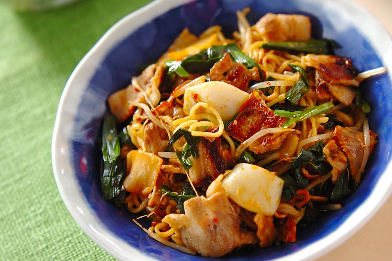 この作り方も、むずかしくありません。先ほどの塩焼きそばと同じように麺を焼いたら、具を炒める前にキムチをフライパンに入れ、炒めましょう。ゴマ油でジャーッと熱すると、キムチとゴマ油の香りが合わさり、食欲をそそる香ばしさになります。これを香りを立てる程度にさっと火を通したら、続いて具を炒めます。その後は、先ほどと同じように麺をフライパンに戻します。味を見ながらショウユや塩・コショウで味付けして完成です。時間が経って酸っぱくなってしまったキムチの処分にも便利。残り物も「キムチ焼きそば」として、おいしくいただけますよ。