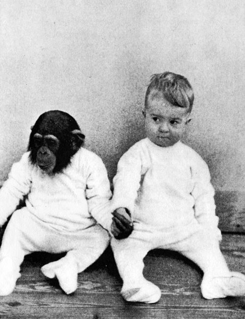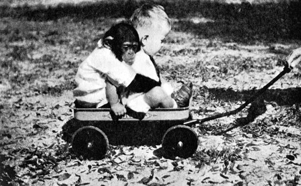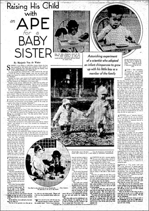 1931年6月26日、7カ月のチンパンジー「グア」がケロッグ博士の家に養子縁組され、10ヶ月のケロッグの息子「ドナルド」と9ヶ月間家族のように過ごしました。同じようにおむつをし、服を着せ、ベビーカーに乗せて散歩をしました。