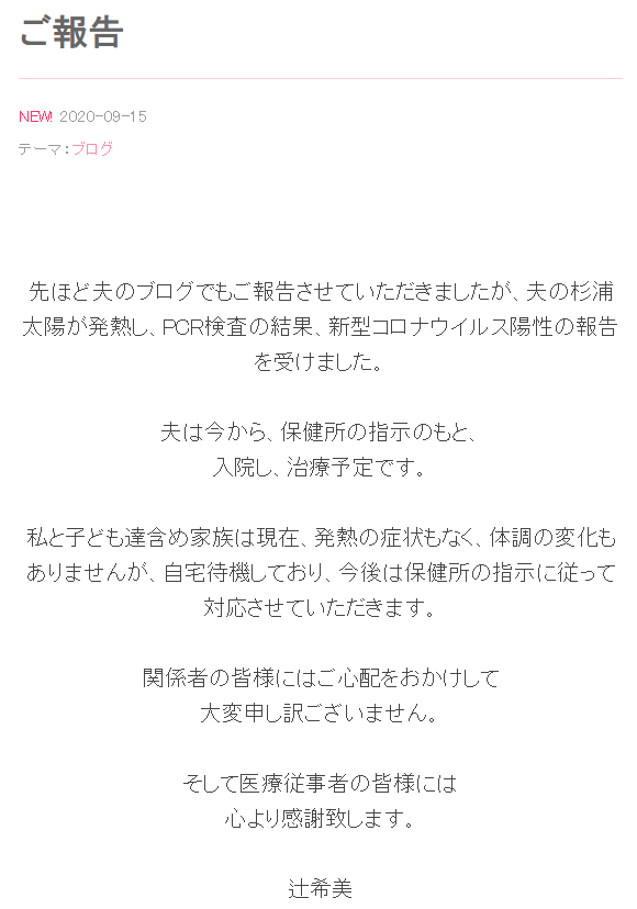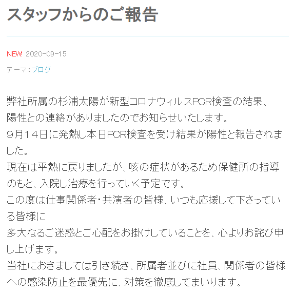 「弊社所属の杉浦太陽が新型コロナウィルスPCR検査の結果、陽性との連絡がありましたのでお知らせいたします。9月14日に発熱し本日PCR検査を受け結果が陽性と報告されました」と説明しました。「平熱に戻りましたが、咳の症状があるため保健所の指導のもと、入院し治療を行っていく予定です」と 現在の容態についても伝えました。