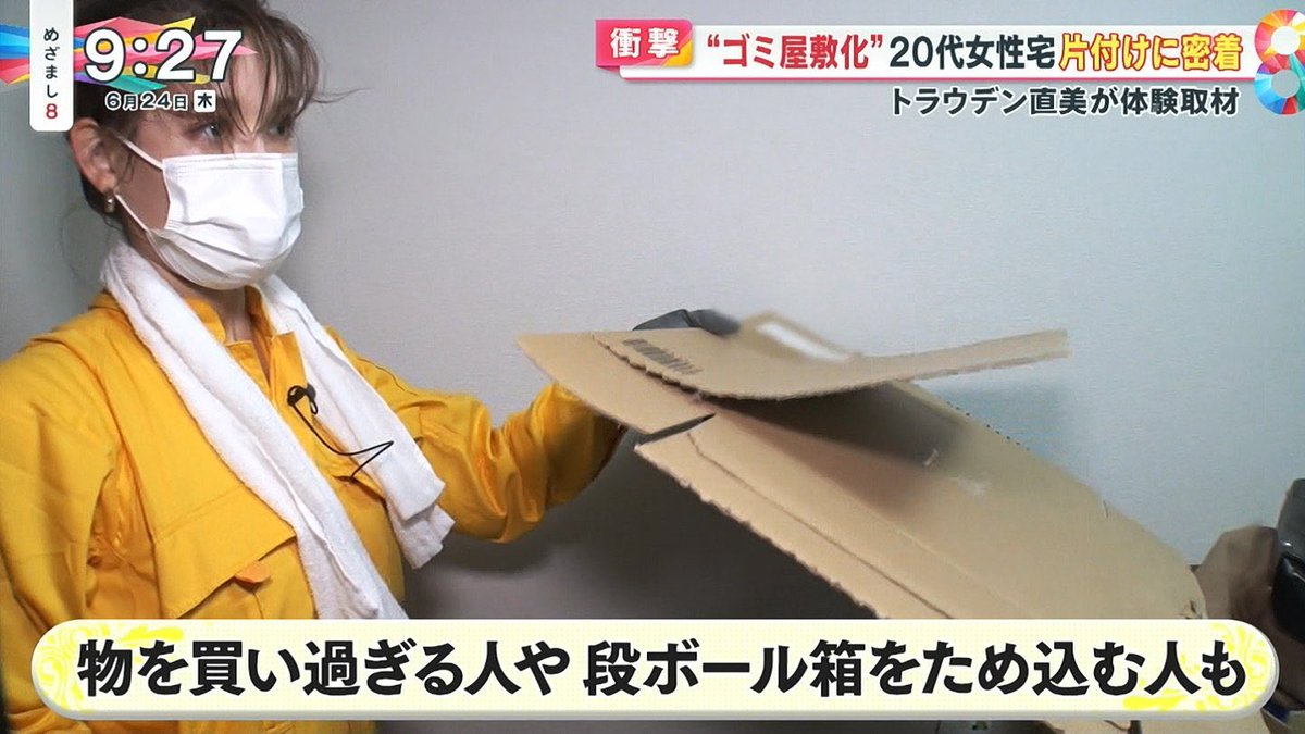 この日の番組は、足の踏み場もないほどのゴミ屋敷に住み、清掃業者へ依頼したという 20代女性に密着。トラウデンさんは 体験取材として業者に加わり、清掃のお手伝いをしていきました。