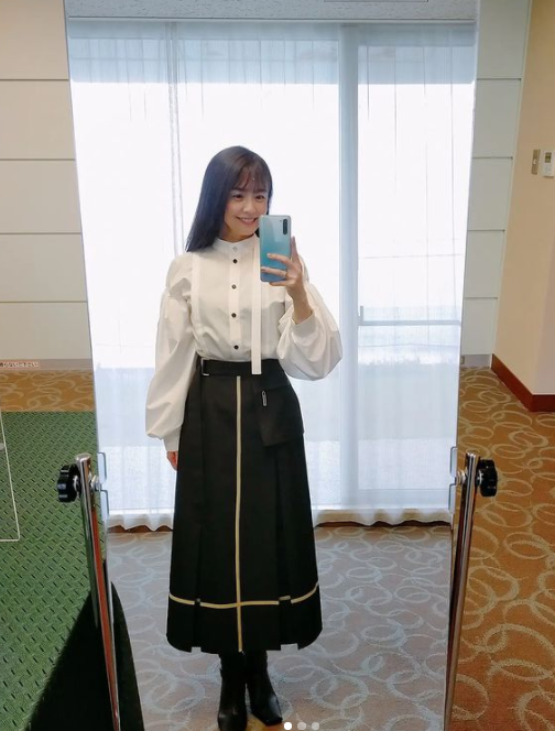 白いブラウスに黒のロングスカート姿で全身の自撮りをしている自身の写真をアップしています。