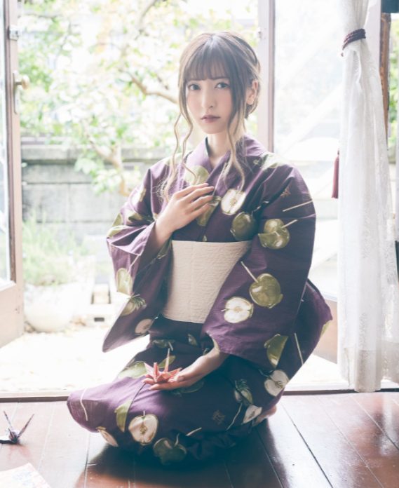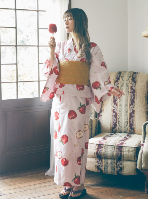 自身が手掛けるレーベル『Maison de FLEUR Petite Robe canone(メゾン ド フルール プチ ローブ カノン)』から出たリンゴ飴の絵が施された2種類の浴衣姿を披露。