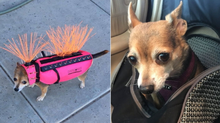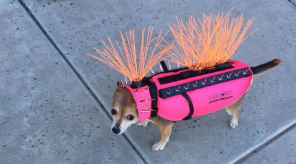 とある日、そんな2人(1人+1匹?)にハプニングが。引っ越しして間もなかった2人は新たな環境に慣れるため散歩に出かけたのですが、そこで突然現れたコヨーテが飼い犬を狙おうとしたのです。幸い犬は大きな事態に見舞われることはありませんでしたが、それ以降、飼い主は飼い犬を野生動物から守る方法を模索し始めます。そんな中で、飼い主はなんとも目につくペット用の外出用の服を見つけ出しました。その服というのが上記のこちらです。蛍光ピンクのその服にはたくさんのトゲが刺さっていますね。