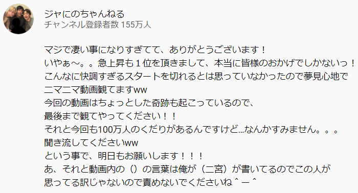 そこには「また、マジで凄い事になりすぎてて、ありがとうございます! いやぁ〜。。急上昇も1位を頂きまして、本当に皆様のおかげでしかないっ! こんなに快調すぎるスタートを切れるとは思っていなかったので夢見心地でニマニマ動画観てます」と二宮さんが書いたと思われるコメントが記載されています。