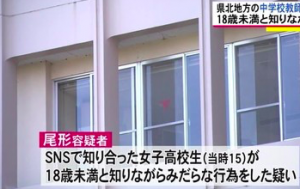福島県警福島署は、二本松市の公立中学校教諭(34)が、18歳に満たないと知っていた県北地方に住む高校1年生の女子生徒にみだらな行為をしたとして、県の青少年健全育成条例違反の疑いで逮捕しました。警察によると、男は女子生徒とSNSで知り合い、複数回やりとりをしていたそうです。今月上旬、男の弁護士から警察に連絡があって事件が明らかになり、11日、弁護士とともに警察署に出頭してきたため、逮捕となりました。男は調べに対し容疑を認め、「SNSは生徒指導の一環としてやり始めた」と供述している様です。