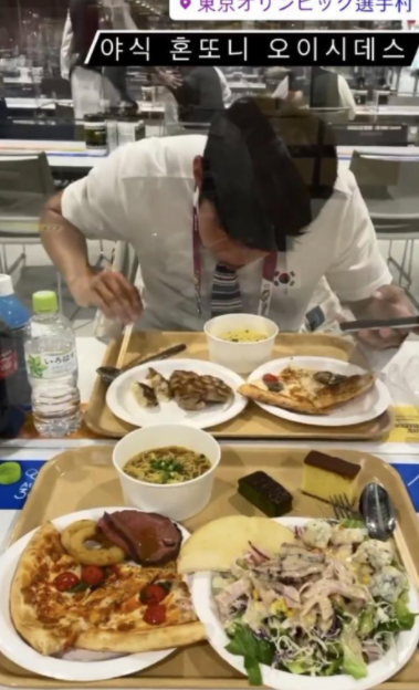 韓国代表ユニホームを着用した選手が、選手村の食堂で食事をしている姿。第三者によって日本のサイトに投稿されたようで、写真にはハングルで『夜食本当においしいです』と書かれています。