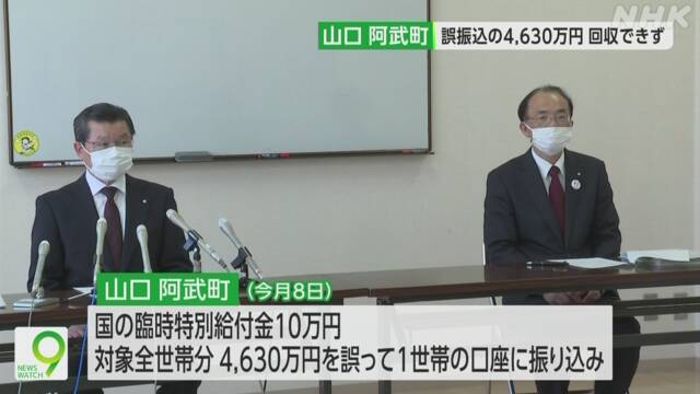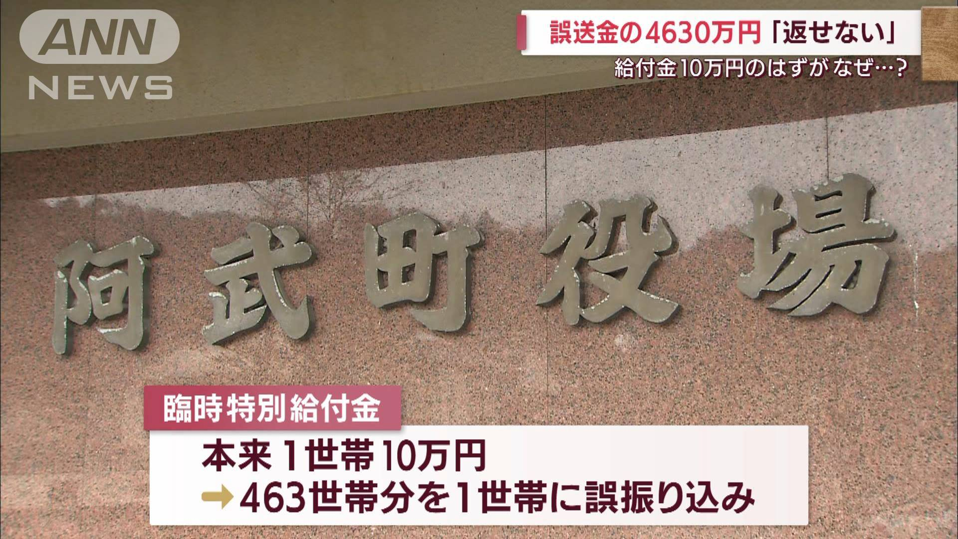 町では金を使ったかどうかや、何に使ったか、いくら残っているかなど、金の流れはつかめていないということです。 振り込みのミスは、職員が事務処理中システム操作を誤ったことが原因で、この町民の世帯を含む対象の全世帯には別に10万円が振り込まれています。 町は今後、警察や弁護士に相談していて、今後告訴も視野に対応を検討する考えだそうです。