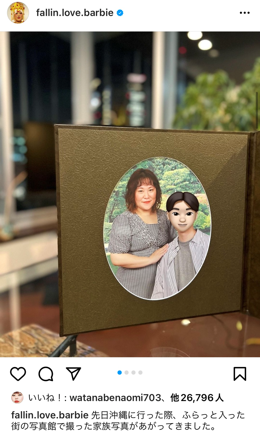 5日の投稿では、夫婦で沖縄旅行に行って来たことを報告し「先日沖縄に行った際、ふらっと入った街の写真館で撮った家族写真」とつづり、夫との2ショットの写真をアップしていました。