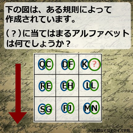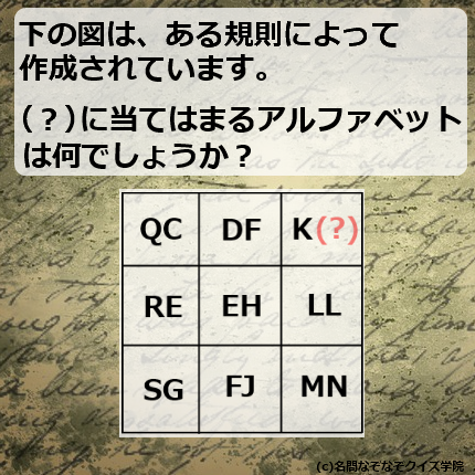以上より、(?)に入るアルファベットは、Lの二つ前のアルファベットである「J」になります。