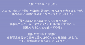 つまり、母役と赤ん坊どちらの名前を言っても、ワニは食べる事が出来ないのです。