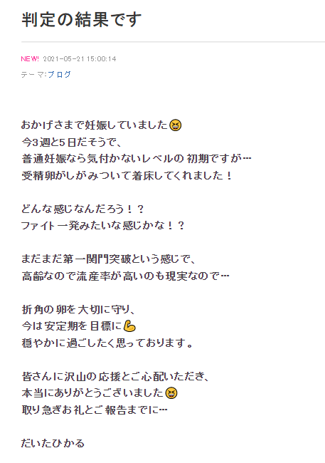 「おかげさまで 妊娠していました 今3週と5日だそうで、普通妊娠なら気付かないレベルの初期ですが…受精卵がしがみついて着床してくれました!」と報告。
