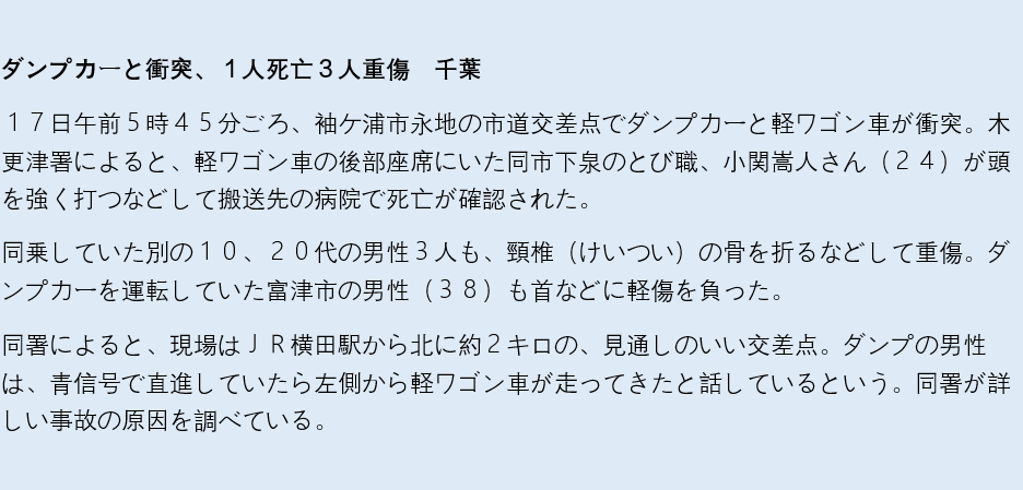 「後部座席で頭を強く打ったってことは、シートベルトしてなくて頭からフロントガラス突き破ってトラックにメリ込んだ可能性あるな 」