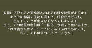 さて、その物質の名前は「一酸化二水素」と言いますが、それは皆さんがよく知っているありふれたものです。