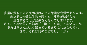 多量に摂取すると死ぬ恐れのある危険な物質があります。またその物質に生物を浸すと、呼吸が妨げられ、息をすることが出来なくなってしまいます。
