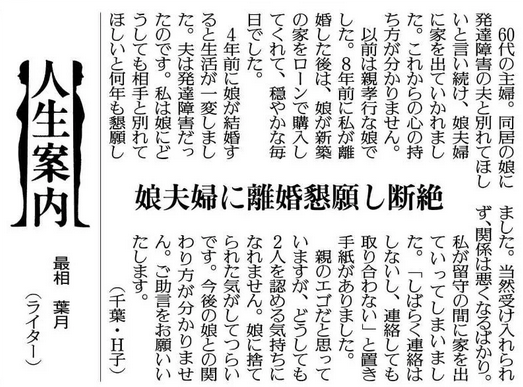 娘の夫が発達障害だということが判明すると娘さんに離婚するよう求めたというのです。