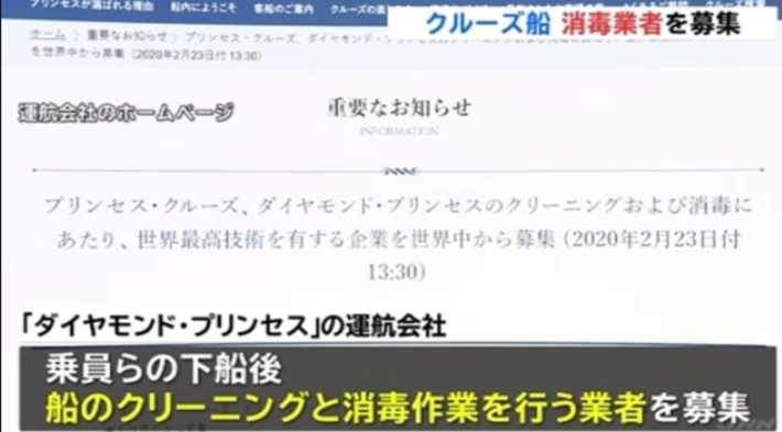 今回、”ダイヤモンド・プリンセス”を運営する米国の船会社”プリンセス・クルーズ”が、船内の清掃及び消毒作業を行う企業を世界中から募集することを、公式ホームページで24日までに発表しました。