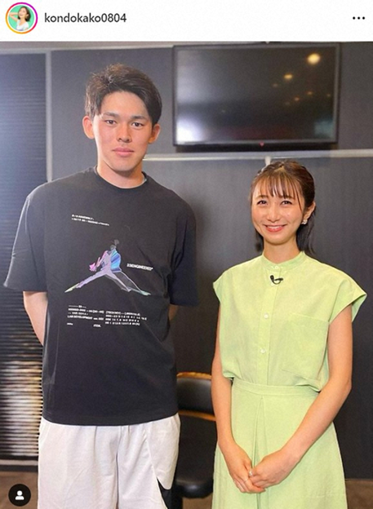 14日、TBSの近藤夏子アナウンサーが自身のインスタグラムを更新し、ロッテの佐々木朗希投手とのツーショット写真を公開しました。