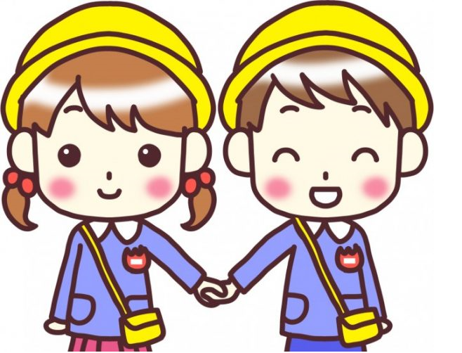ニコニコで手をつなぎ、楽しそうにスクールバスのバス停に向かって歩いてゆきました。