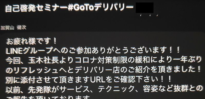 このLINEのグループ名は〈自己啓発セミナー#GoToデリバリー〉。参加者は常に入れ替わりがありますが、大体30人前後とみられ、全員が支店長やエリア長などの役職者です。