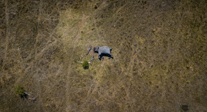 「ボツワナ北部、象牙目当てのアフリカゾウの密猟を空撮。密猟者は近くにあるキャンプからたった20分という場所で、ゾウの牙と鼻をチェーンソーを使って切り落とした。密猟は急激に増加しており、ボツワナ北部では2014年から2018年の間だけで死骸数が593%も増加している」