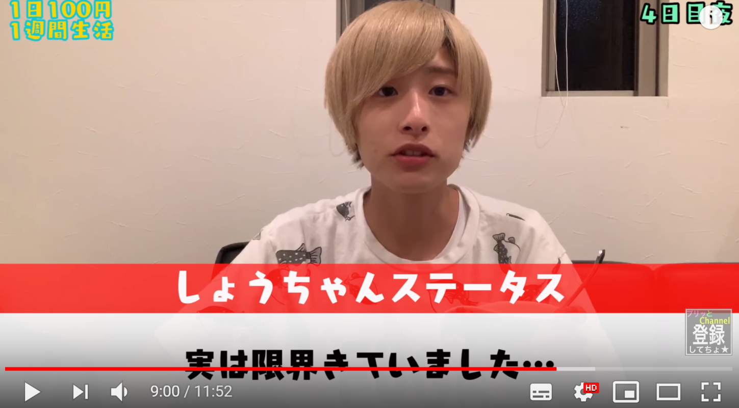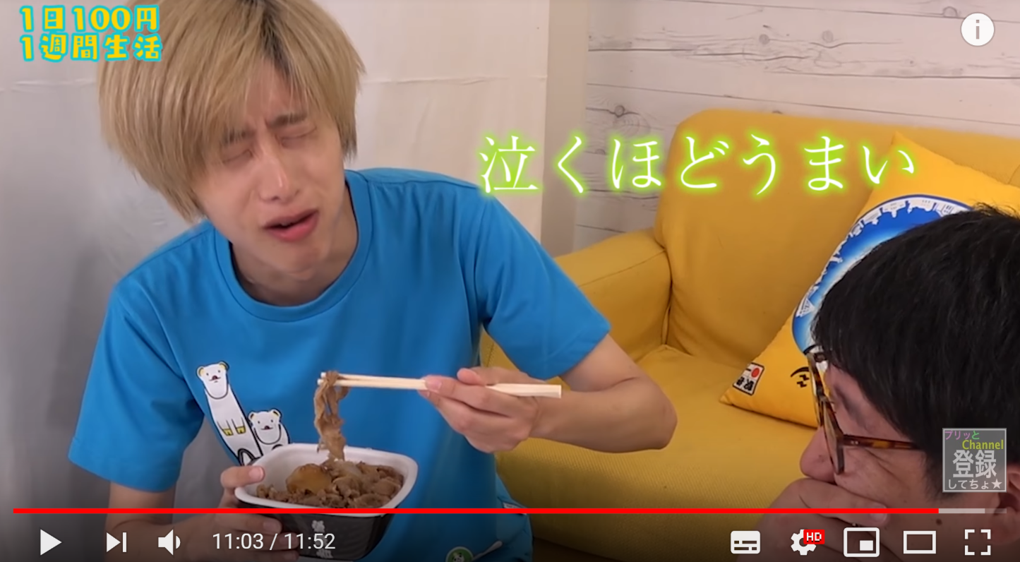 しょうちゃんは動画の中で、始終「お腹空いた」と言いながら、4日目の夜には「かなり限界でございます」と話していました。翌日の5日目には撮影に遅刻し、遅刻してきたしょうちゃんの手には吉野家の牛丼がありました。