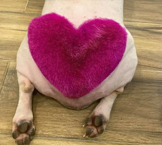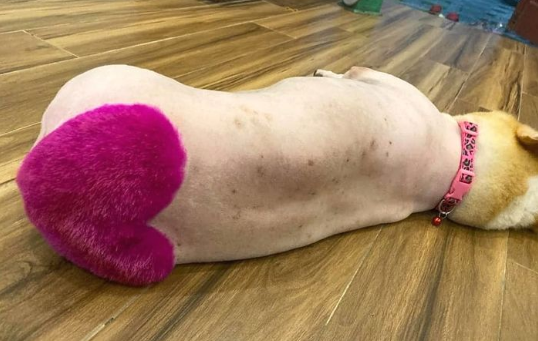 体毛を全剃りされ後ろをピンクのハートに染められた飼い犬