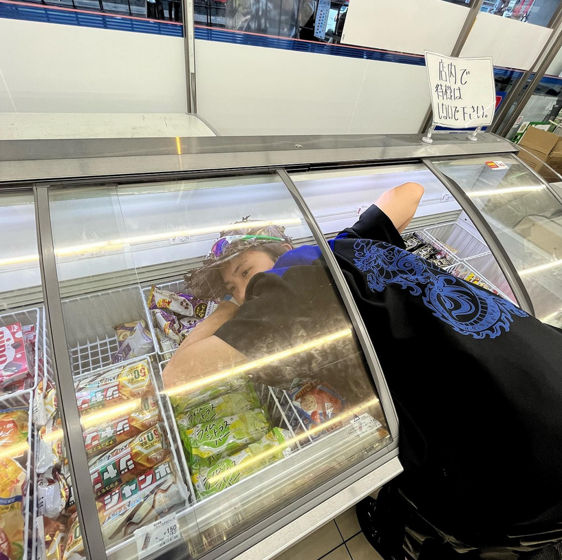 コンビニのアイスケースにダイブする様子をインスタグラムに自ら投稿した男性。