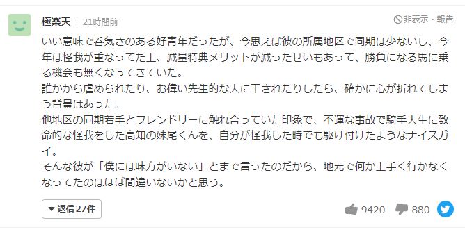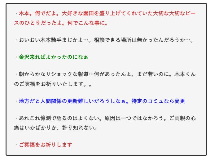 兵庫県警甲子園署によると、木本さんは10日に父親と会ってから連絡が取れなくなり、12日に家族が県警に行方不明届を出すとともに居場所を捜索。父親が18日に木本さんの軽乗用車を見つけたそうです。軽乗用車の助手席に横たわる状態で見つかり、スマートフォンには「僕には味方がいない」というメモが残っていたことが明らかになりました。木本さんは園田競馬場(尼崎市)に所属していました。