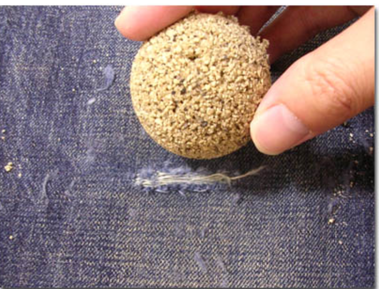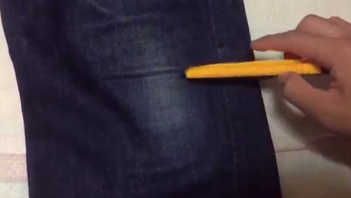 作りたいダメージジーンズを見本にしつつ、まずはデニム生地を軽石でこすります。いきなりハサミで切ってしまうと、明らかに切りましたというようなダメージ具合になるので注意です。軽石でこすることによって、色が少しずつ落ちてきます。そこにダメージを加えることで、自然なダメージに出来るのです。軽石は100円均一で購入出来ます。いい具合の色落ちになったら、ハサミを入れる部分に仮で線を引きます。切りすぎると膝が出過ぎてしまったり、ダメージが小さいのもバランスが悪いのであらかじめ線を引いておくことで失敗するリスクが減ります。