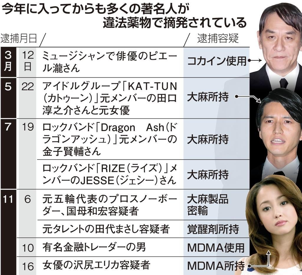 著名人が違法薬物に絡んで逮捕されるケースは後を絶ちません。今年に入り、俳優や元アイドル、ミュージシャンらが相次いで逮捕されました。4~5月には経済産業省と文部科学省のキャリア官僚が覚せい剤所持などで逮捕されました。11月6日に逮捕されたハーフパイプの元五輪代表、国母和宏容疑者は、米国から営利目的で大麻を密輸した疑いが持たれています。芸能人だけが捜査対象ではないのです…。