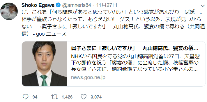 27日、ジャーナリストの江川紹子氏がツイッターを更新。そこには、NHKから国民を守る会の丸山穂高議員が「饗宴の儀」の席で、秋篠宮眞子様へ婚約延期となっている小室圭さんについて「お寂しいですか」などと聞いたとされることについて「ゲス!という以外、表現が見つからない」と非難した内容が投稿されました。
