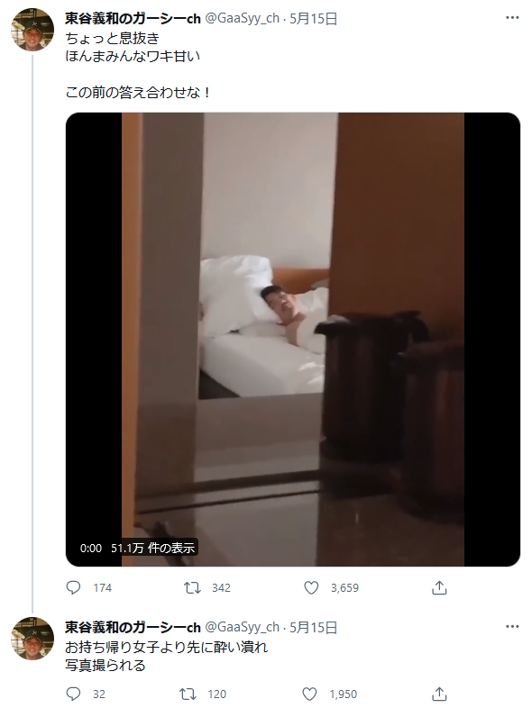 お持ち帰りした女子より先に酔い潰れ爆睡する俳優Eの姿を暴露しました。