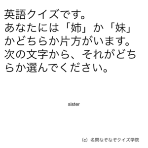 ”「姉」か「妹」かどちらか” 問題文のある部分に注目してみましょう 今回ご紹介するのは脳トレクイズです。 問題 英語クイズです。 あなたには「姉」か「妹」かどちらか片方がいます。 次の文字から、それがどちらか選んでください。 Google ADVERTISEMENT Google あなたはわかりましたか? それでは答え合わせに行きましょう! Google 答えは、、、「妹」 ADVERTISEMENT 「小さいsister」なので、「little sister(妹)」が答えになります。 Google あなたは間違えずに解けたでしょうか! ADVERTISEMENT Google [著作権者VONVON /無断コピー、無断転載および再配布禁止(違反時の法的措置)]