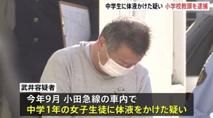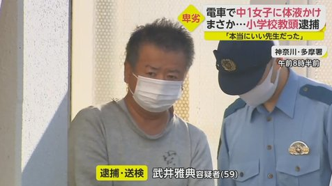 2020年9月、小田急線下北沢駅から登戸駅へ向かう電車の中で偶然乗り合わせていた女子中学生に体液をかけた疑いで逮捕された武井雅典容疑者。職業は小学校の教頭とのことですが、当時被害に遭った女子生徒がホームで泣いていたことから駅員が事情を聞き、110番通報したとのことです。