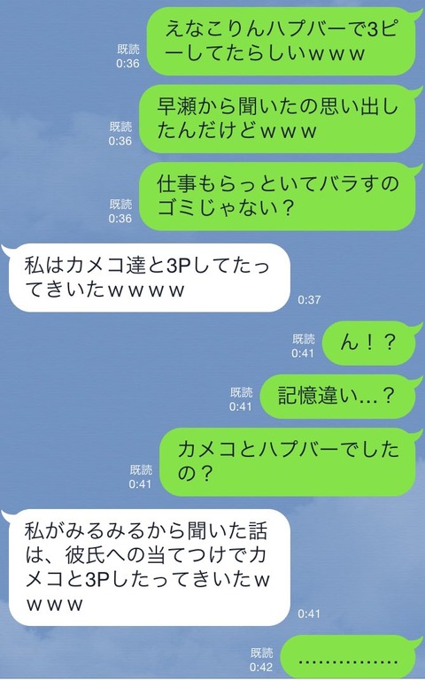 経緯はまずある人物のLINEの会話をスクショした画像が流出したことからでした。【流出したラインの会話】「えなこりんハ⚫️バーで3ピーしてたらしいwww」「早瀬から聞いたの思い出したんだけどwww」「仕事貰っといてバラすのゴミじゃない?」『私はカメコ達と3ピーしてたってきいたwww』「ん!?記憶違い・・・?カメコとハ⚫️バーでしたの?」「私がみるみるから聞いた話は、彼への当てつけでカメコと3ピーしたってきいたwww」