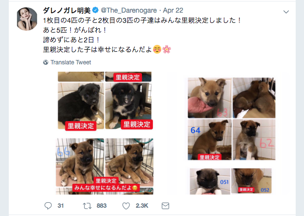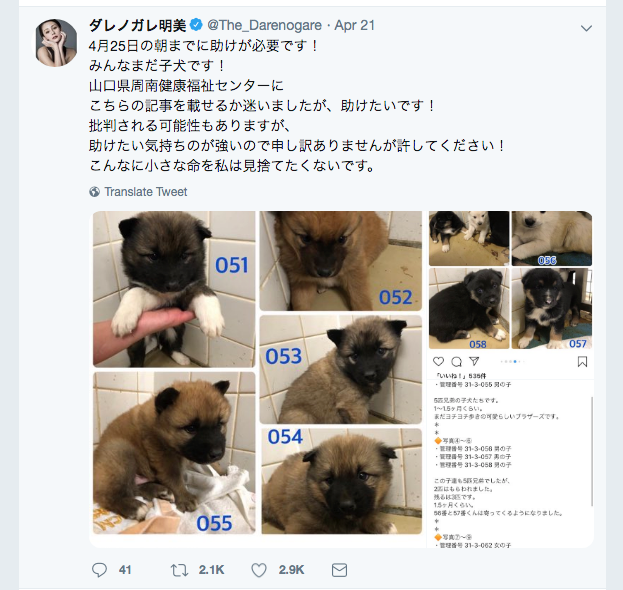 「4月25日の朝までに助けが必要です!みんなまだ子犬です!(中略)批判される可能性もありますが、助けたい気持ちのほうが強いので申し訳ありませんが許してください!こんなに小さな命を私は見捨てたくないです」とツイートし、その後も同様のツイートを発信し続けていました。