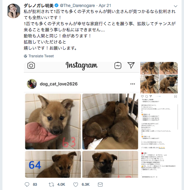 しかし、ダレノガレのツイートをよく見てみると、彼女は保護犬の里親探しも手助けしているようです。