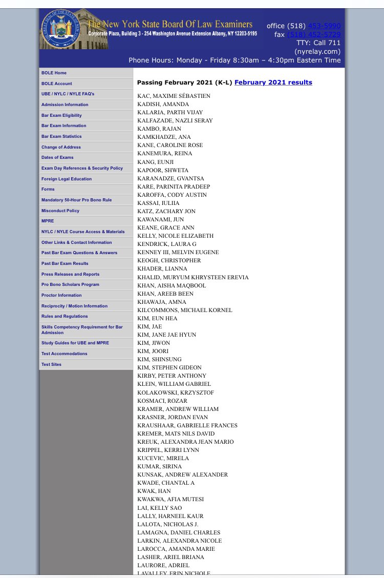 ニューヨーク州法務委員会(New York State Board of Law Examiners)は29日、公式HPで合格者のリストを発表しました。7月司法試験結果(July 2021 Bar Examination Results)というタイトルで並べられた「K」の欄に小室圭さんの名前はありませんでした。