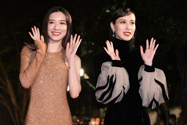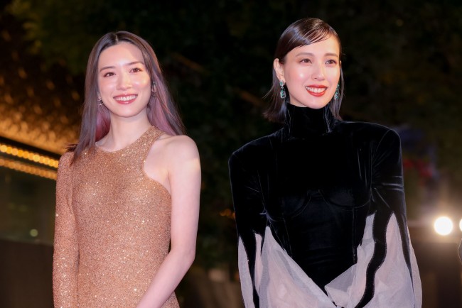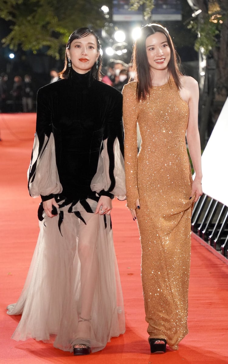 戸田恵梨香は数メートルはあるロングトレーンドレス姿で、永野芽郁は左肩を肌見せした黄金色に輝くタイトなドレス姿で登場しました。レッドカーペットのスタート地点に立った2人は、無数のカメラフラッシュを浴び、まばゆい光を放っています。対照的な色合いのドレスをそれぞれ美しく着こなしていた戸田と永野に、会場の注目が集まりました。