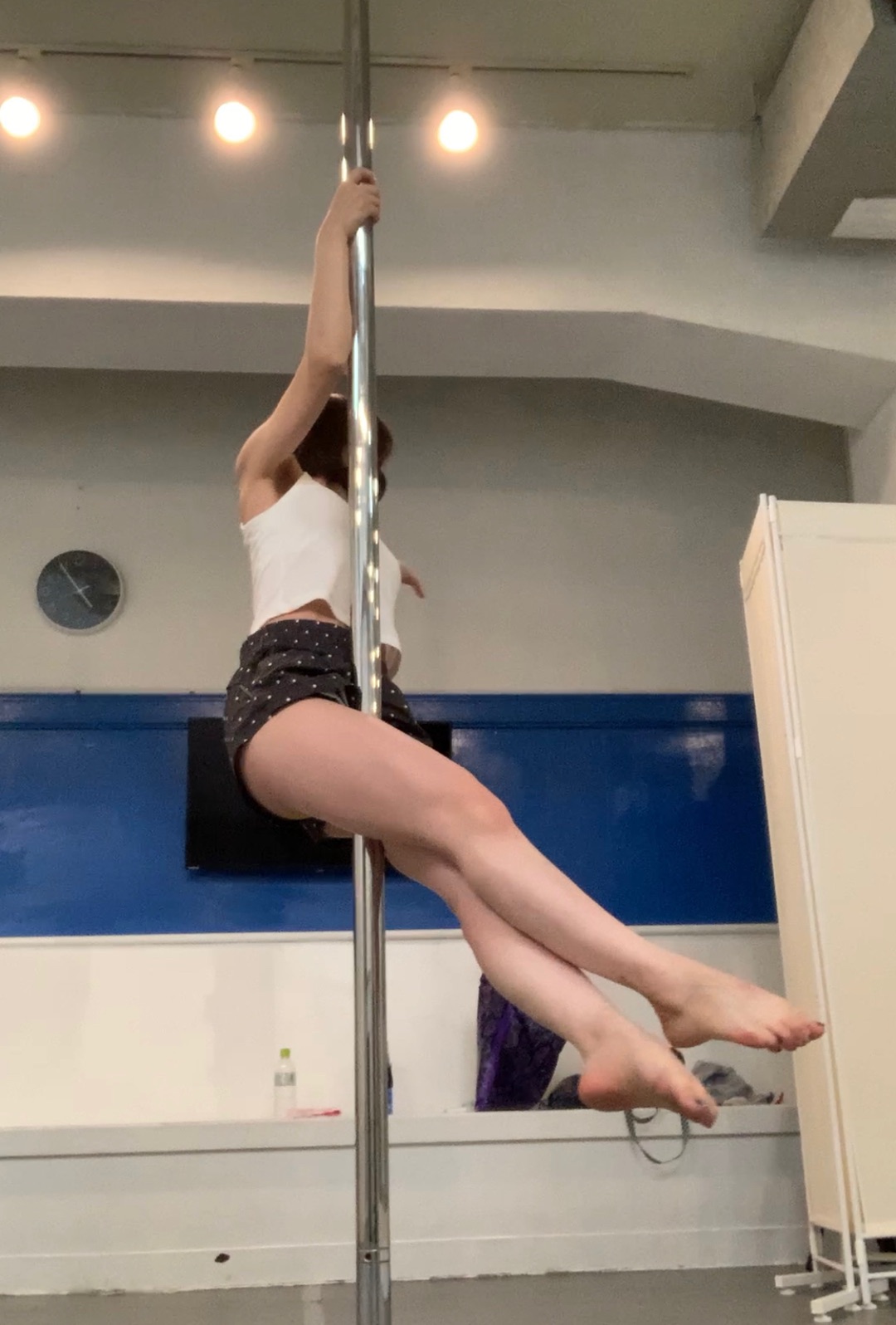タンクトップはお腹が見えるタイトでショートなデザインで、短パンも脚の付け根部分がユルユルのタイプのため推定Dのバ◯トの輪郭が丸わかりで、下半身も短パンの脇から美脚の奥が見えてしまいそうでした。しかも、そんな格好でポールを登ったり下りたりしつつ、床にねそべっては突き出し腰をクネクネさせるのだからファンも大興奮でした。