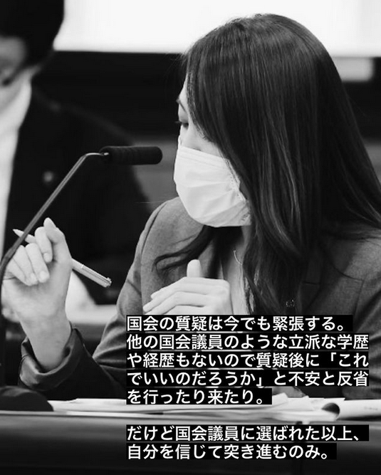 今回インスタグラムに投稿したのはどこか弱気な今井議員の率直な気持ちでした。不安を口にするも最後には自分を信じることへの決意で締めくくっています。