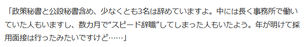 なんと昨年末にかけて秘書が複数名退職していたことが判明したのです。改選を迎える夏の選挙は非常に重要なものとなってきますが、サポート側の周辺スタッフらが次々に離れて行くのは痛手ですね。