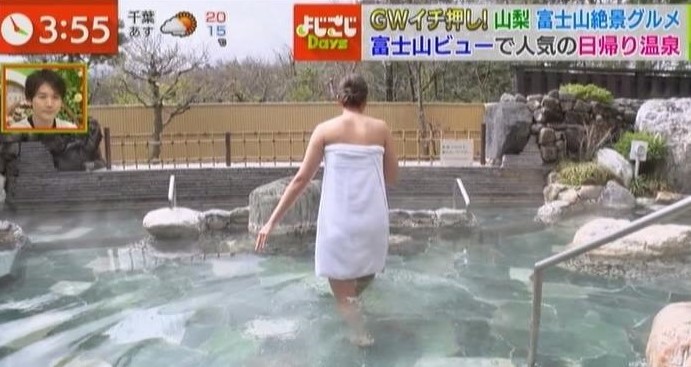 田中が温泉に向かって歩きながら「亜美ちゃん、入浴シーンはOKですか?」と問うと、稲村は「お風呂入りましょうよ!」と意気揚々と言い「撮影も大丈夫です」と快諾すると、田中は「ほえー」と感心しました。男湯、女湯に分かれて入浴し、雪が舞う中、バスタオルで胸のあたりを隠した稲村は「よし!」と意を決して湯に入ります。