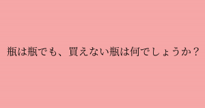 「瓶は瓶でも、買えない瓶は何でしょうか?」 問題文をよく読んでみると分かってくるかも…? 今回ご紹介するのは脳トレクイズです。 問題 : 瓶は瓶でも、買えない瓶は何でしょうか? Google ADVERTISEMENT Google あなたはわかりましたか? それでは答え合わせに行きましょう! Google 答えは、、、「火炎瓶」 ADVERTISEMENT 「買えない瓶」を略して言うと「買えん瓶」です。買えん瓶だけに「火炎瓶」が答えになります。 Google ADVERTISEMENT あなたは間違えずに解けたでしょうか! Google [著作権者VONVON /無断コピー、無断転載および再配布禁止(違反時の法的措置) ADVERTISEMENT