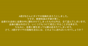 答えは、、、「1、A君は金庫の中にダイヤの指輪を入れて、鍵Aをかけた上でBさんに送る。