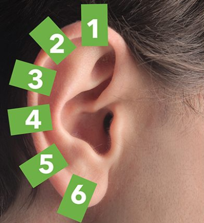 コンピューター作業をしていると、上半身を前かがみになり、背中と肩の痛みを感じやすいですよね。洗濯バサミを両側の耳たぶの一番上の部分(写真の中の1番)に挟んで数分待機。痛みがひどくなる前にこの方法を利用してみてくださいね。