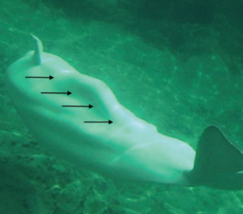 すると、シロイルカのお腹にあった幅10〜14cm、長さ1mの2列の贅肉が1分間ほど消えてしまったのです。贅肉は一体どこへ行ったの!?しかし、シロイルカがくるっと回転して上下逆さまになると、再び贅肉がお腹に現れたのでした!